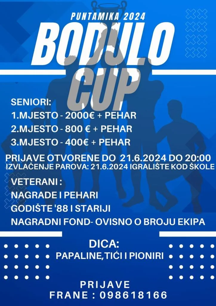 Prijave za Bodulo Cup, najatraktivniji seniorski turnir u Zadarskoj županiji, otvorene su do 21.06.2024. do 20:00 sati. Izvlačenje parova održat će se isti dan na igralištu kod škole, a prijaviti se mogu seniori, veterani i djeca.