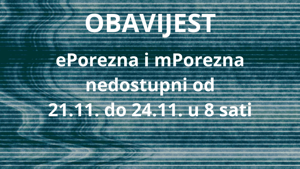 Zbog planiranih radova na provedbi Projekta će, u razdoblju od petka, 21. studenog 2025. od 16 sati do ponedjeljka, 24. studenog 2025. do 8 sati, biti nedostupne elektroničke usluge i servisi Porezne uprave za građane i poduzetnike.