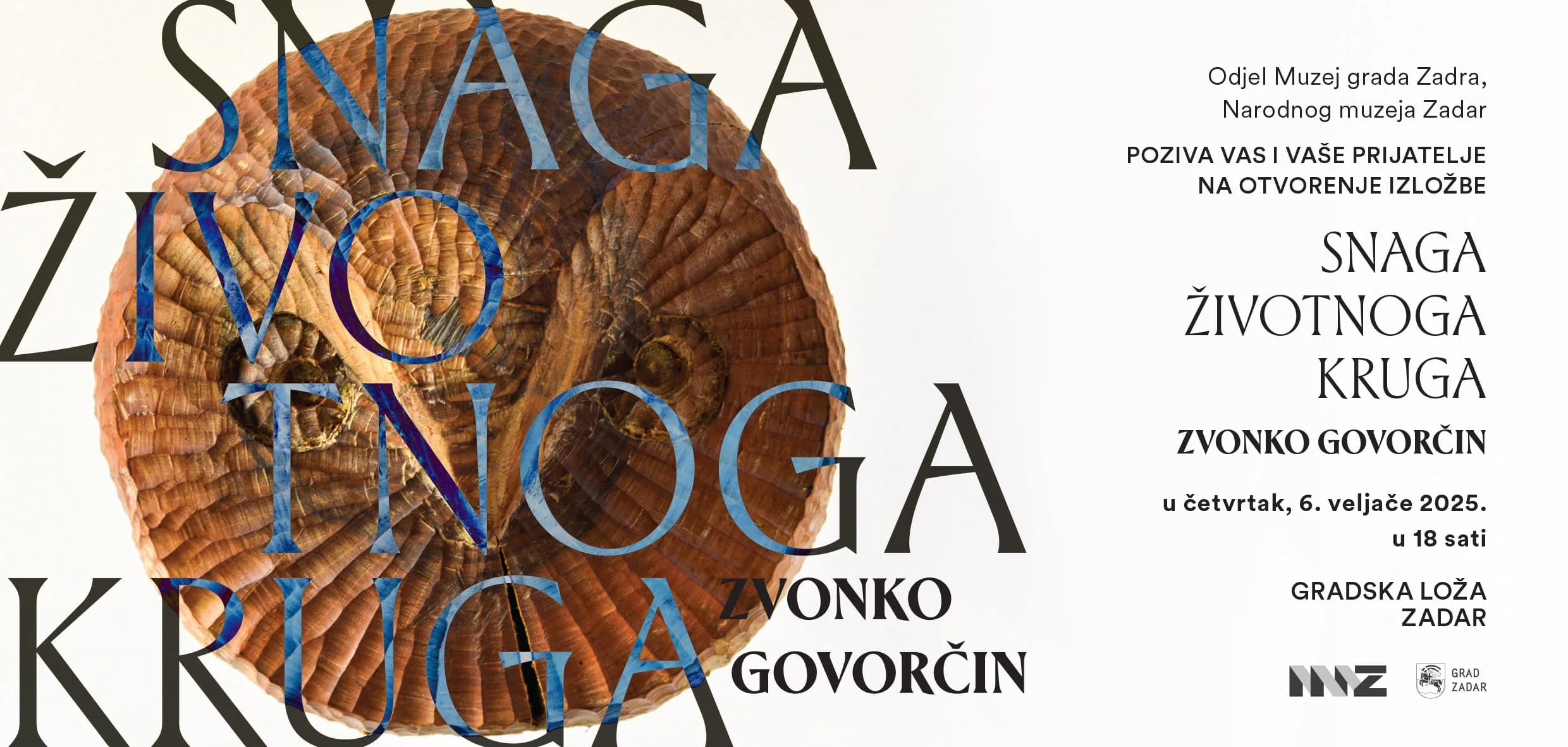Odjel Muzej grada Zadra Narodnog muzeja Zadar poziva sve ljubitelje umjetnosti na otvorenje izložbe „Snaga životnoga kruga – Zvonko Govorčin“, koje će se održati u četvrtak, 6. veljače 2025. godine u 18 sati u Gradskoj loži.