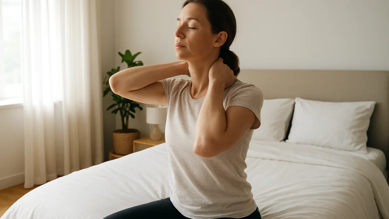 Primjer jednostavnog istezanja je polagano naginjanje glave u stranu, uz zadržavanje položaja 15 do 20 sekundi. Time se isteže bočna strana vrata, što mnogim ljudima donosi trenutno olakšanje. Slično tome, kruženje ramenima potiče cirkulaciju i smanjuje osjećaj težine u ramenom pojasu. Ove vježbe mogu se izvoditi čak i dok sjedite na rubu kreveta.