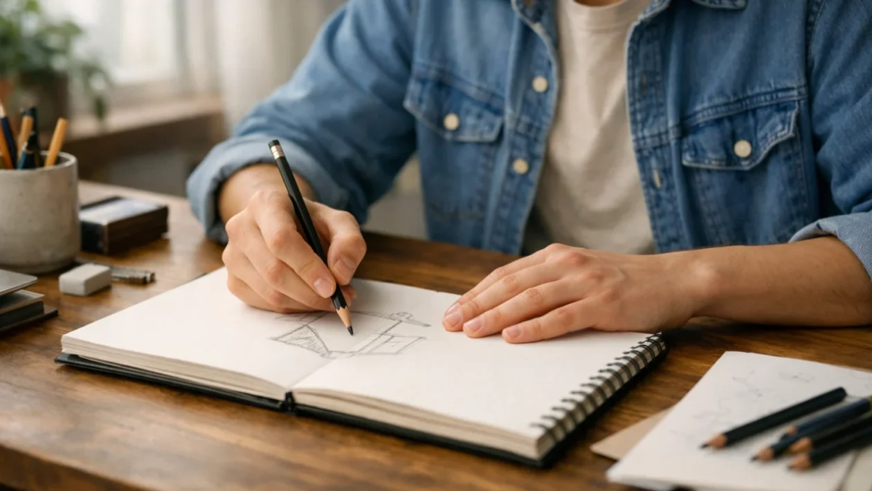 Prvi praktični korak jest odabir minimalnog pribora. Dovoljni su obična grafitna olovka i bilježnica, jer fokus treba biti na vještini, a ne na opremi. Previše alata često odvlači pažnju i stvara pritisak. Jednostavan početak olakšava kontinuitet.