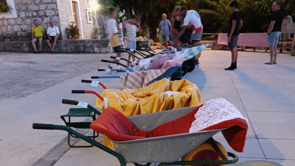 Glavni dio manifestacije bila je dodjela nagrade „Zlatna karijola“ za najljepšu karijolu i najbolje vještine rukovanja karijolom na poligonu. Sudionici su imali priliku i sami glasovati za najljepšu karijolu, čime je dodatno potaknuto zajedništvo i uključivanje publike u program. Posebnu čar večeri donijela je i projekcija antologijskoh hrvatskog filma “Buža” i serije “Malo misto” – gledane iz karijola! Posjetitelji su sjedili u svojim ili posuđenim karijolama, stvarajući jedinstven ambijent koji se rijetko gdje može doživjeti.