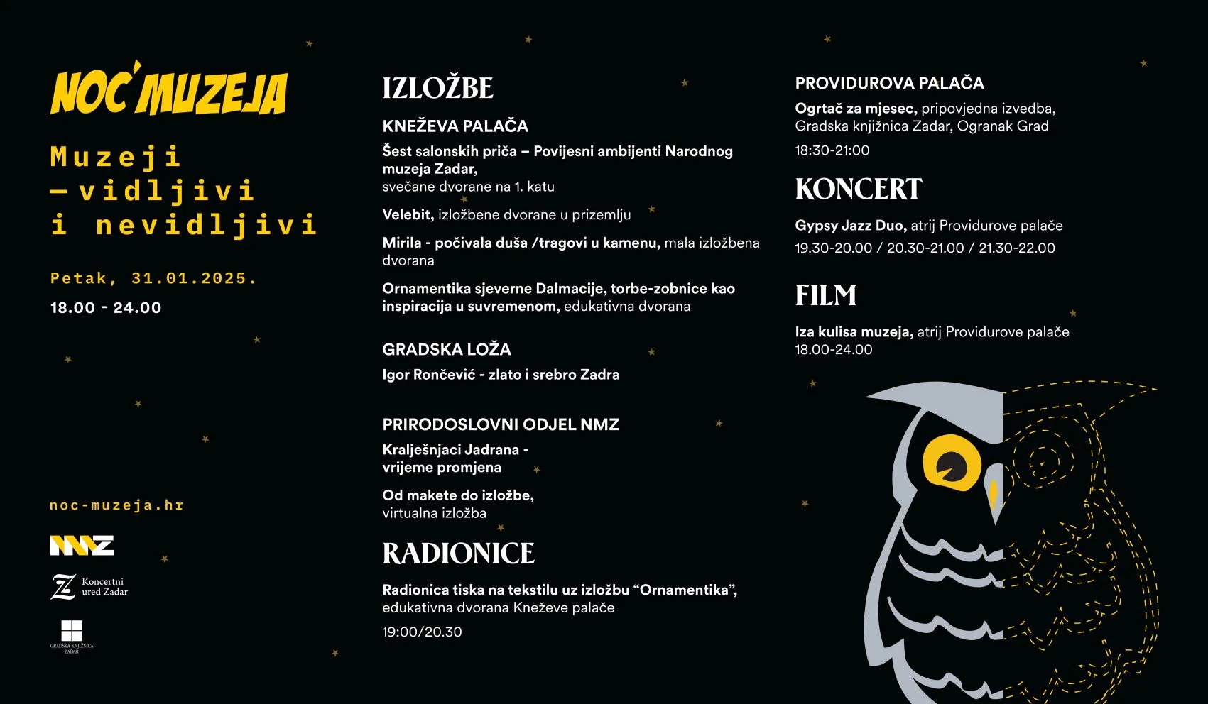 Zadar, 31. siječnja 2025. – Ovogodišnja Noć muzeja, s temom Muzeji – vidljivo i nevidljivo, donosi bogat program u Narodnom muzeju Zadar i partnerskim institucijama. Od 18 do 24 sata, posjetitelji će moći istražiti povijesne, umjetničke i prirodoslovne izložbe, sudjelovati u kreativnim radionicama te uživati u koncertima i filmskim projekcijama.