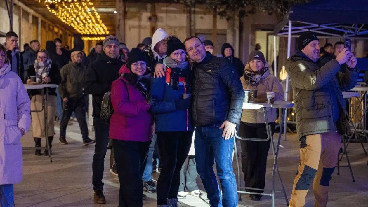 Glavni gradski trg u novogodišnjoj noći bio je ispunjen brojnim građanima i posjetiteljima, veselim osmjesima i blagdanskim ozračjem unatoč hladnoj silvestarskoj večeri.