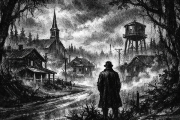Kinematografski poster s usamljenom figurom uz šumsku cestu, mračna atmosfera i duboke sjene u charcoal film noir stilu.