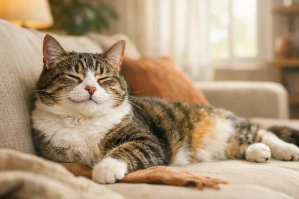 Mačka koja mirno prede u domu, simbol umirujućeg zvuka i emocionalne povezanosti