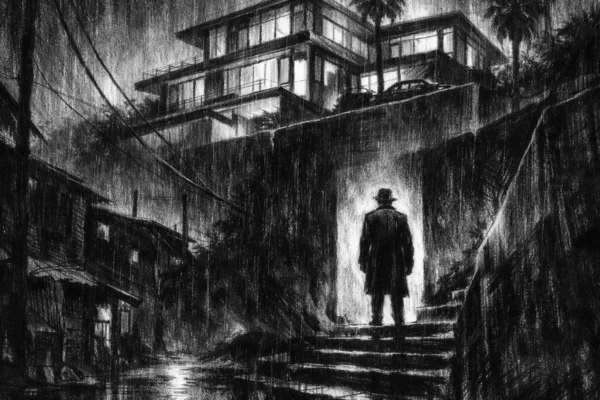 Filmski poster s modernom kućom i samotnom figurom između svjetla i sjene, u charcoal film noir stilu, crno-bijelo, snažan kontrast i tjeskobna atmosfera.