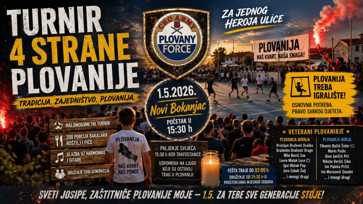 Turnir 4 strane Plovanije 2026 ponovno potvrđuje da Plovanija nije samo mjesto stanovanja, već kvart u kojem zajedništvo ima stvarno značenje. Tradicionalni malonogometni turnir održava se 1. svibnja 2026. na Novom Bokanjcu i još jednom okuplja sve generacije – od djece do starijih mještana. Iako je sport u središtu događaja, turnir nosi i jasnu poruku mjesnog odbora: Plovaniji nedostaje osnovna infrastruktura, prije svega igralište. Upravo zato ovaj događaj ima važnost koja nadilazi teren i rezultat.