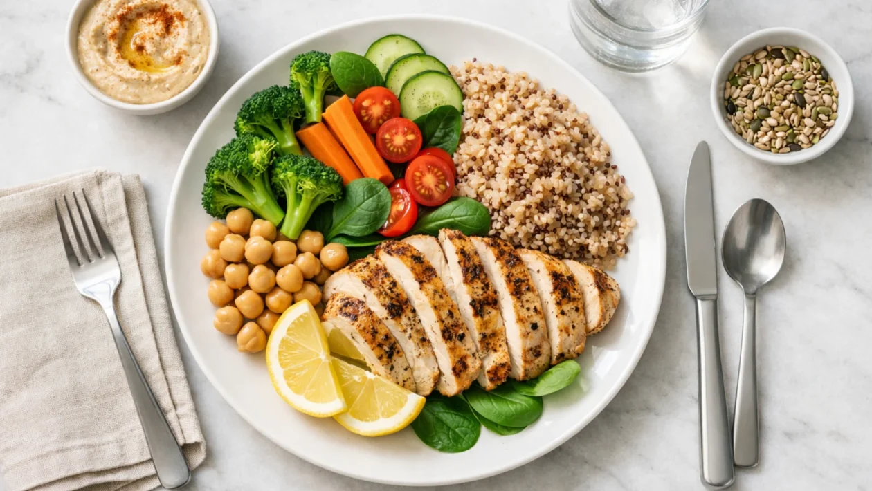 Primjer uravnoteženog ručka može biti tanjur s pečenom piletinom, kuhanom smeđom rižom i velikom porcijom miješane salate. Na taj način lako se postiže preporučeni omjer bez vaganja. Čak i uz dodatak žlice maslinova ulja, obrok ostaje uravnotežen i zasitan.